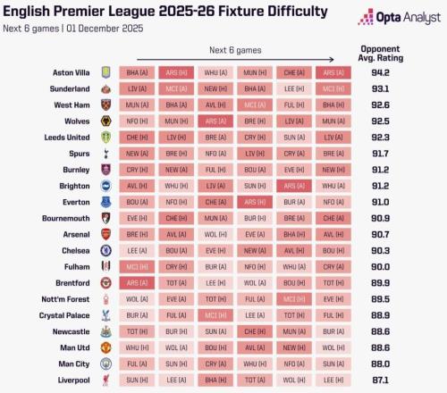 Opta计算英超各队未来6轮赛程难度:维拉最难,利物浦最容易