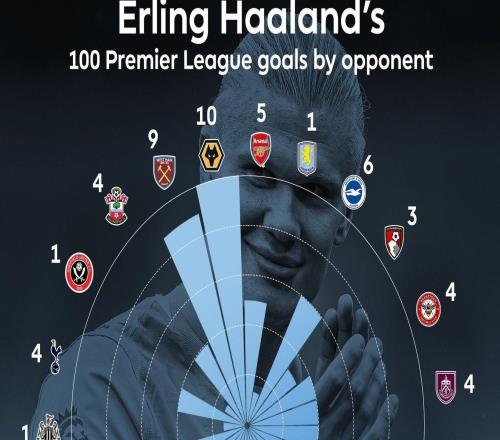 哈兰德英超100球分布:狼队10球最多,西汉姆9球、曼联8球