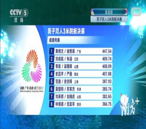 值得一提的是,在今年5月的全国跳水冠军赛上,谢思埸和黄博文这对广东组合就夺得男子双人三米板冠军。11月3日举行的十五运会男子团体比赛中,谢思埸和黄博文也是作为搭档出战双人3米跳板,助力广东队摘得了跳水男子团体金牌。